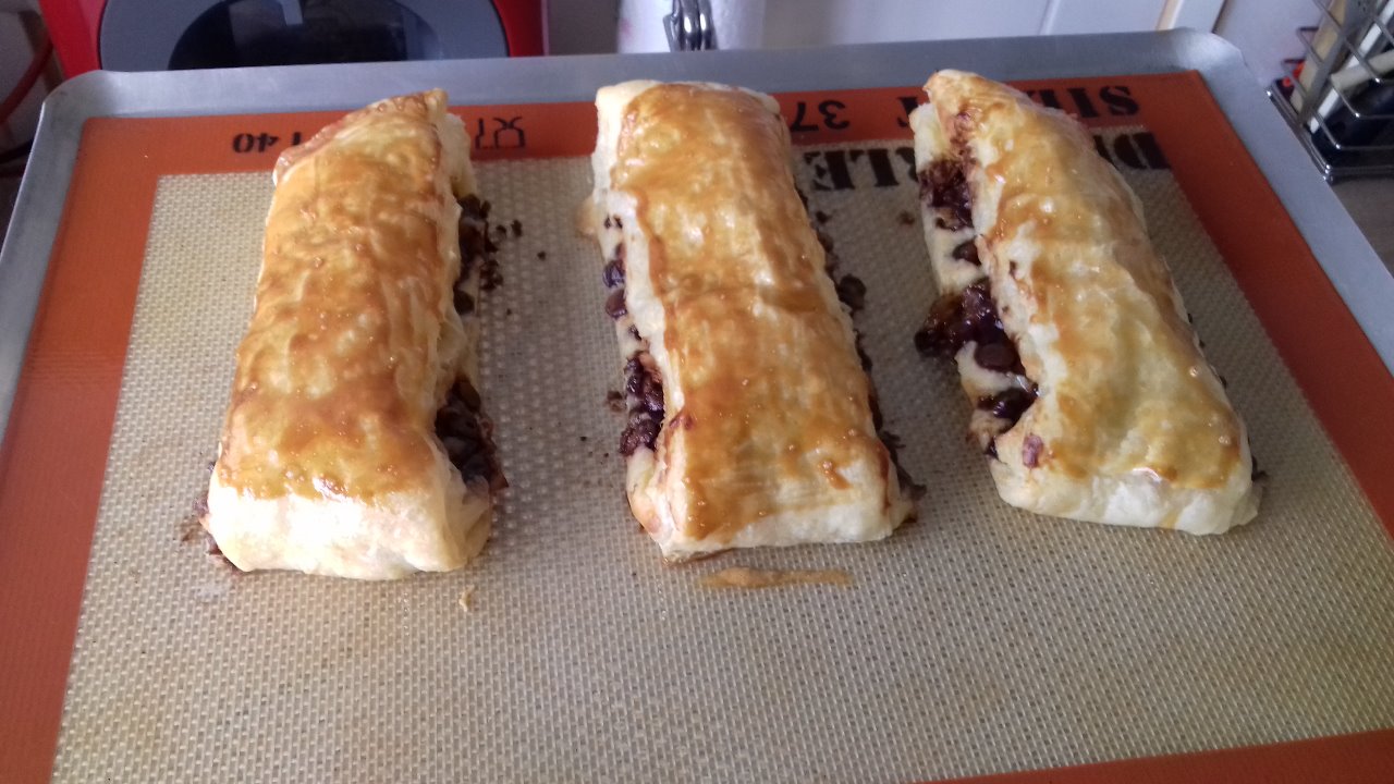 Etaler votre pâte feuilletée, sur la moitié y mettre la crème vanillée et les pépites de chocolat, refermer avec l'autre moitié de pâte.