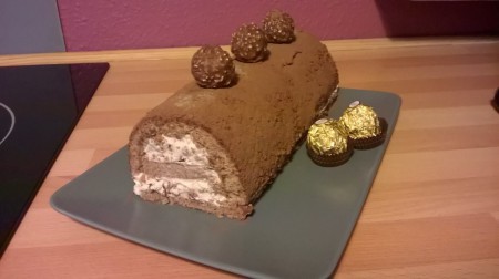 Une fois démouler décorer soit d'un glaçage, pour ma part j'ai saupoudrer de cacao en poudre et mis des paillettes or et des ferrero entiers...