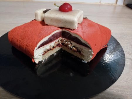 Pour la décoration ici j'ai fait bombé (bombe velour) mon entremet à la sortie du congélateur faute de temps mais vous pouvez le glacer.